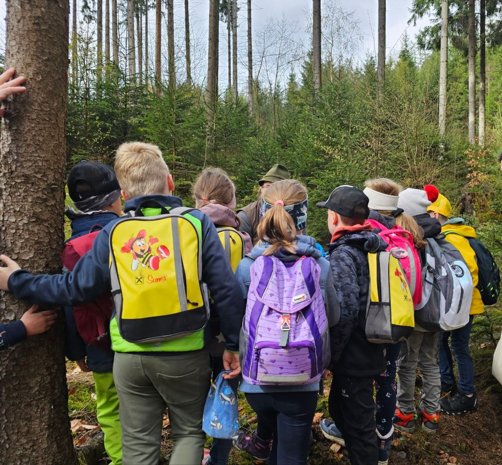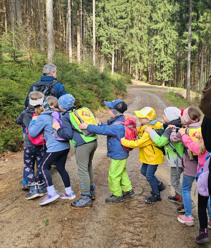 Dann ging es schon auf zum Fußmarsch in den Wald. Den Weg entlang der Straße fabulös gemeistert, traten wir gemeinsam in den Wald ein. Ein selbst gesuchter Waldschatz war die Eintrittskarte zum Wald und die Schätze wurden dann gemeinsam bestaunt und beschrieben.