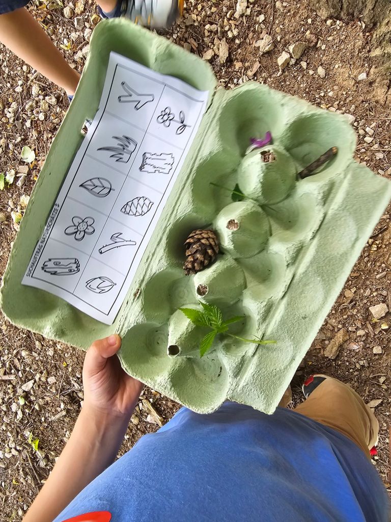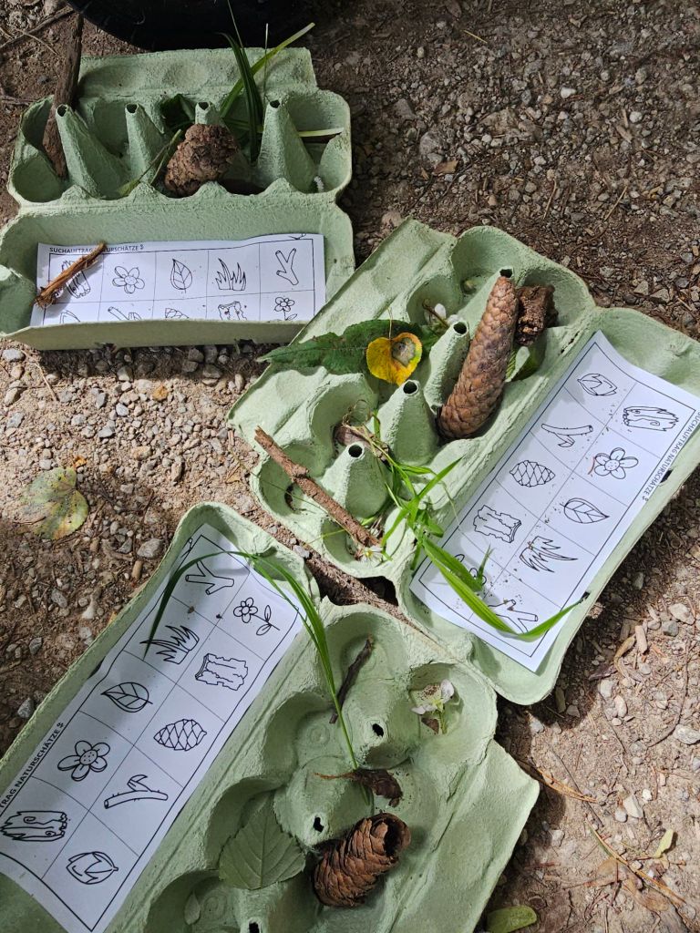 Wie gewohnt haben wir uns vorgestellt, beim Geburtstag nur mit 10 Kindern, gibt es auch Namensschilder mit einem Tiernamenmerkspiel. Anschließend die Regeln besprochen und gleich im Tierpark umgesetzt. Wir haben die Haustiere betrachtet und nachmittags selten sogar ein paar Wildschweine erblickt. Den Großen war das schnell langweilig also haben wir Wald-Bingo gespielt und Waldschätze in Eierbechern gesammelt.